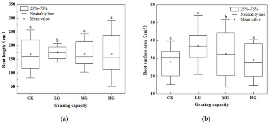 The number of root tips (Figure 3d) in the LG plot was also significantly higher than that in other grazing plots. The order of specific root length was CK> HG> LG > MG (Figure 3e), and no significant difference in the specific surface area of S. krylovii was observed under different grazing intensities (Figure 3f). Overall, LG was beneficial to promote the longitudinal growth of roots.
