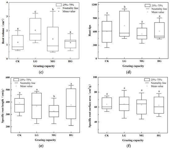 Spatial variation of Stipa krylovii root properties under different grazing intensities: (a) root length, (b) root surface area, (c) root volume, (d) root tips, (e) specific root length, and (f) specific root area. Note: Letters indicate differences among different grazing intensity groups for the same indicator (p < 0.05). Significant differences between variables are marked by different letters.