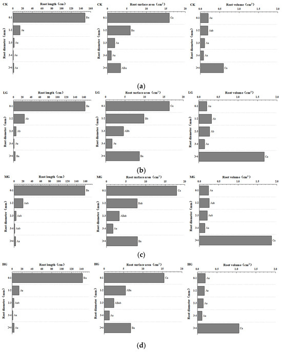 The composition of various diameter classes was represented by the length, surface area, and volume of roots in different diameter classes under varying grazing intensities (Figure 4). The significance of root length, root surface area, and root volume of the same diameter class among single vegetation types under different grazing intensities exhibited certain rules. The root diameter was divided into five grades, with 1 mm as the gap. In the range of the 0–1 mm diameter class, the order of root length was LG > MG > CK > HG and the order of root surface area was MG > LG > CK > HG. The root volume under different grazing intensities was not different, and that under HG was the highest. In the range of 1–2 mm diameter, the order of root length, root surface area, and root volume consistently showed the order of LG > MG > HG > CK. In the range of 2–3 mm diameter class, the order of root length was consistent with that in the 0–1 mm diameter class and the order of root surface area and root volume was consistent with that in the 1–2 mm diameter class. In the range of the 3–4 mm diameter class, the root length, root surface area, and root volume also showed the order of LG > MG > HG > CK. When the diameter was >4 mm, the root length was LG > HG > MG > CK, the root surface area was LG > MG > HG > CK, and the root volume was MG > LG > HG > CK.