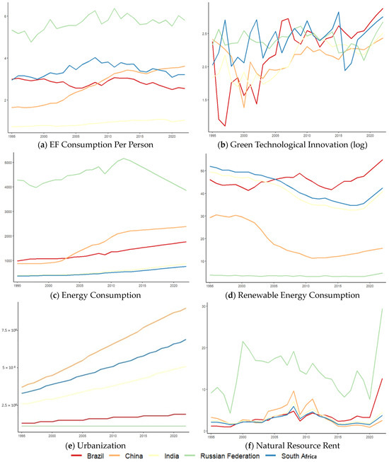 To quantify the extent to which the natural environments of the BRICS countries are degrading, this research uses the ecological footprint (EF). Institutional quality, urbanization, rent from natural resources, innovation in green technology, energy consumption, and usage of renewable energy were some of the characteristics examined in this empirical study as they related to ecological footprint. This supports the findings of earlier studies [38,70,71].