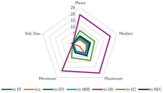 We set out to examine the BRICS nations’ environmental imprints across time by looking at how factors including institutional quality, urbanization, rent from natural resources, green technological innovation, energy consumption, and use of renewable energy have played a role. When comparing the BRICS nations, Russia’s energy consumption and environmental impact are the most prominent, while India’s sustainability potential is the most promising (Figure 1). Green technology adoption differs, with Brazil leading, and China and South Africa showing potential. Renewable energy use is rising globally, with Brazil at the forefront. China leads in urbanization, while Russia falls behind. China is falling behind in natural resource rent, while Russia excels; both countries are increasingly dependent on resources. This provides a detailed and balanced view of the BRICS landscape, emphasizing advancements and obstacles in resource management and sustainable development. A radar chart of descriptive statistics has been provided in Figure 2.