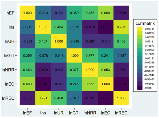 Figure 3 showcases a correlation heat plot depicting the relationships between key variables. The ecological footprint positively correlates with green technological innovation, information and communication technology, total natural resource rent, and energy consumption. Conversely, it correlates negatively with urbanization, institutional quality, and renewable energy consumption. This nuanced analysis offers insights into the intricate interplay among these variables, shaping our understanding of their environmental impact.