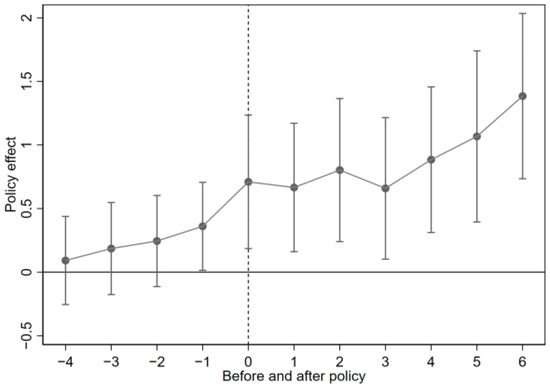 A graphical method is used to compare the trends in the level of entrepreneurship of new agricultural subjects before and after the pilot. As can be seen from Figure 1, there is no significant difference in the level of entrepreneurship of new agricultural subjects before the implementation of the pilot policy. After the implementation of the innovation policy, the effect of the policy began to appear and, with the implementation of the policy, the impact on the level of entrepreneurship of new agricultural subjects is increasing. Therefore, the impact of the innovation policy on the level of entrepreneurship of new agricultural subjects does not have a lag and the impact of the policy is sustainable.