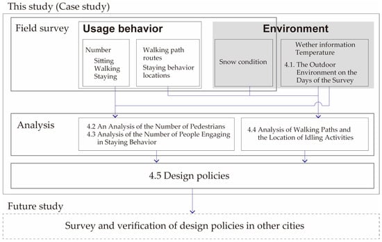 Figure 1 outlines the research approach adopted for this study. This investigation aims to identify public space design policies encouraging usage behavior during winter in snowy and cold cities. This study involved selecting a public space as a case study, conducting a field survey during winter, and analyzing the relationship between usage behavior and the outdoor environment to clarify relevant design policies. The design policies identified in this study are intended to be applied to other cities after verifying their applicability using surveys and further analysis. This section describes information on the case study area used for this study, as well as the methods employed to conduct field research.