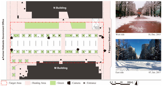 Figure 3 provides information on AKAPLA Plaza, which is the only outdoor plaza defined in the government’s urban planning in downtown Sapporo. The AKAPLA Plaza was originally a roadway. This roadway was developed into a plaza in 2014. Vehicular traffic was prohibited, and the adjacent buildings (N Building and M Building) were redeveloped. The east side of AKAPLA Plaza faces Sapporo Station Road, which runs through the center of downtown Sapporo. Moreover, the former Hokkaido Government Office Building, a popular tourist attraction, stands on the west side of the plaza. The N Building and M Building are located on the north and south sides of AKAPLA Plaza, respectively. Both buildings feature restaurants and commercial stores on the lower floors and offices on the upper floors. AKAPLA Plaza is one of the busiest areas in downtown Sapporo, with many businesspeople, shoppers, and tourists passing through. Most sidewalks in downtown Sapporo are heated to melt the snow. The locations of heated walkways in AKAPLA Plaza are shown in Figure 3. Only the central walking path of the plaza is heated; the other areas are reserved for snow accumulation.