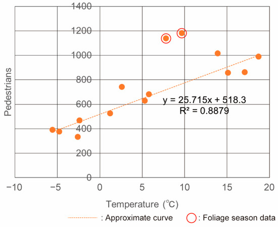 The relationship between the number of pedestrians and temperature is shown in Figure 4. The number of pedestrians tended to decrease as temperatures decreased. In contrast, many pedestrians were observed during the fall foliage season. A strong correlation between temperature and the number of pedestrians was observed in the data excluding the foliage season (coefficient of determination [R2] = 0.9). No strong relationship was found between the number of pedestrians and the presence of snow cover.