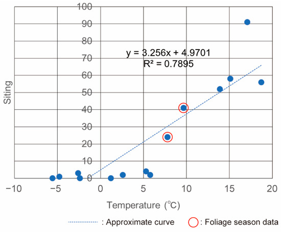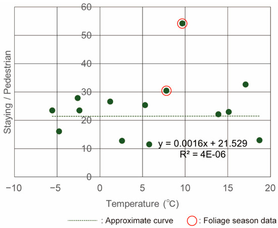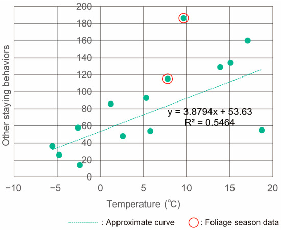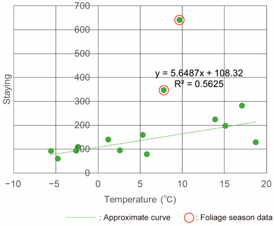 The relationship between the number of people engaging in staying behaviors and temperature is illustrated in Figure 7. The number of staying behaviors showed a gradual decrease as temperatures decreased. However, during the fall foliage season, many staying behaviors were observed. A correlation between temperature and the number of staying behaviors was observed in the data excluding the foliage season (R2 = 0.6).