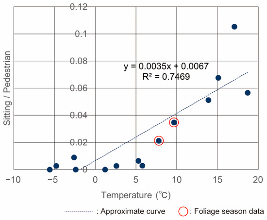 The relationship between the ratio of the number of sitting incidents to the number of pedestrians according to temperature is shown in Figure 6. The ratio of the number of sitting incidents to the number of pedestrians also tended to decrease as the temperature decreased, demonstrating a strong correlation (R2 = 0.7). A trend was observed whereby the number of pedestrians decreased as temperatures dropped; the percentage of sitting people also decreased slightly alongside these temperature drops.