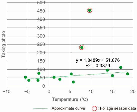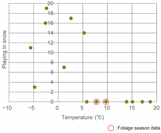A more detailed analysis was conducted by categorizing staying behaviors into three types: taking photos, playing in the snow, and others. The relationship between the number of photo-taking behaviors and temperature is shown in Figure 9. During the fall foliage season, many photo-taking behaviors were observed. When excluding the fall foliage season, a weak correlation was observed between temperature and photo-taking behaviors, with a gradual decrease in the number of photo-taking behaviors as temperatures decreased; however, the number of photo-taking behaviors remained almost flat.