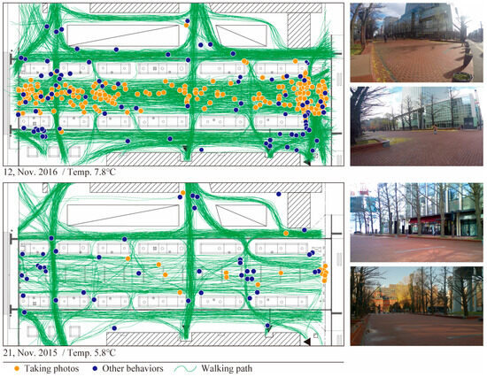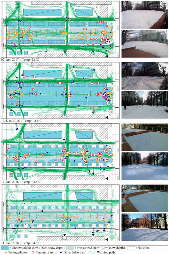Regarding walking paths, on the survey days without snow cover, the paths were dispersed, with people meandering throughout the plaza. Therefore, it is likely that those who walk at AKAPLA Plaza are not simply on their way to a destination but rather are walking for enjoyment. However, on survey days with snow cover, the walking routes were concentrated in areas with little (low-snow-cover areas) or no snow cover, and walkers often avoided areas with heavy snow cover (high-snow-cover areas). On survey days with large areas of low snow cover (7 January 2017; 11 January 2016), the walking paths were dispersed, with walkers meandering through areas of low snow cover.