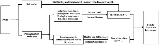 The classical theory of human capital suggests that family investments in education, as a strategy for resource allocation, are influenced by the overall family budget [31]. In an ideal scenario without credit constraints, optimal decision making in family education investment would align its internal return with that of the capital market. However, within the context of household budget constraints, families may reduce their expenditure on education, thereby impacting the accumulation of human capital [60]. The persistent low levels of human capital in rural China may stem from long-standing credit constraints on households [61]. The PARP, as a poverty alleviation policy aimed at reducing poverty and increasing income, has the potential to influence family education investments by altering the cost of living or expected income levels. Specifically, the PARP can affect investment in education for relocated households through several mechanisms (refer to Figure 1).