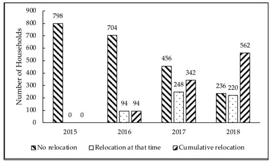 The sample comprised registered poverty-stricken households and households relocated synchronously as part of the 13th Five-Year Plan for the PARP. Excluded from the sample were poverty-stricken households that had been cleared, abandoned for relocation, or that were beneficiaries of policies such as dangerous house renovation, rural scenic area development, and old site reconstruction. Additionally, our sample was limited to households with students, as our dependent variable focused on student education investment. After eliminating observations with missing information, we obtained a sample of 2394 observations from 798 households over three waves. Among these, 94 households were relocated in 2016, 342 households in 2017, and 562 households in 2018. A summary of the households’ relocation process is provided in Figure 2.