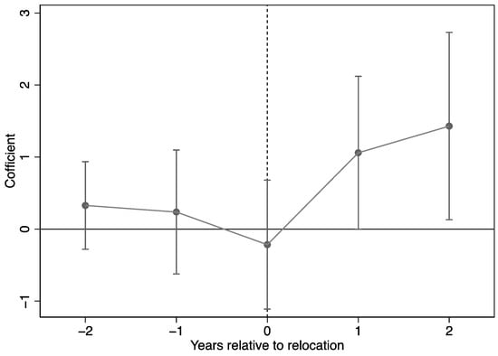 where is a set of dummies indicating a five-year window around the relocation year of the PARP (from three years before to two years after) (specifically, the forward term for the first three waves before relocation and the lagged term for the last two waves after relocation are obtained by subtracting the years of data collection (2015, 2016, and 2018) from the years of relocation occurrence (2016, 2017, and 2018)). m = 0 signifies the year when the relocation took place, and m = −2, −1, 0, 1, 2. In the regression, we used the group where m = −3 as a benchmark. Thus, measures the treatment effect of assigning a household into the treatment group m years after the relocation compared to the effect three years before the relocation.