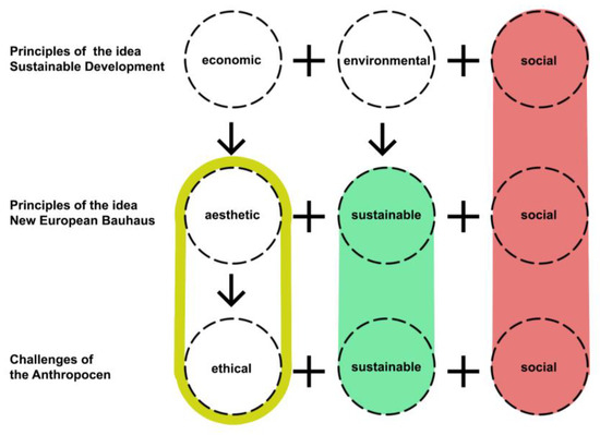 According to the New European Bauhaus Idea, three values become important: beauty, sustainability, and being together—the social aspect [76]. One can see discrete changes concerning the fundamental foundations by analysing successive urban development concepts. Economic issues become unsustainable, while beauty and ethics appear as new ones. So, the materialistic approach is offset by spirit and essence (Figure 2).