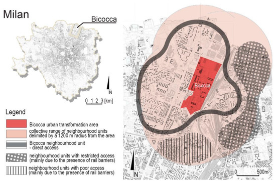 The empirical study with retrospective elements concerns the urban transformation of the Bicocca post-industrial area in northern Milan. The transformation took place between 1985 and 2005. It included the plan conceptualisation stage (I), the operational stage of adapting the project to formal requirements (II), implementation (III), and the post-transformation stage (IV), which falls in the last decade. Several considerations dictated the choice of this case study. The first relates to the territorial site, covering some 70 ha of former factory land (Pirelli tyre and rubber products factory). This was the second architectural and urban development after Potsdamer Platz in Berlin. A second argument was the presence of housing estates nearby and the fact that the transformation was a social problem—mainly related to the loss of many thousands of jobs—around 3000 in the last period. The additional passage of time made it possible to compare the state before and after the transformation. A limitation of the research is the lack of access to the opinions of residents and the local community at the time of the transformation. A mitigating factor is that the project resulted from significant international competition, the results of which were widely known and discussed in public forms. A final argument in favour of the choice of the type of location is the fact that many similar investments have the potential to happen—if only in central and eastern European countries.