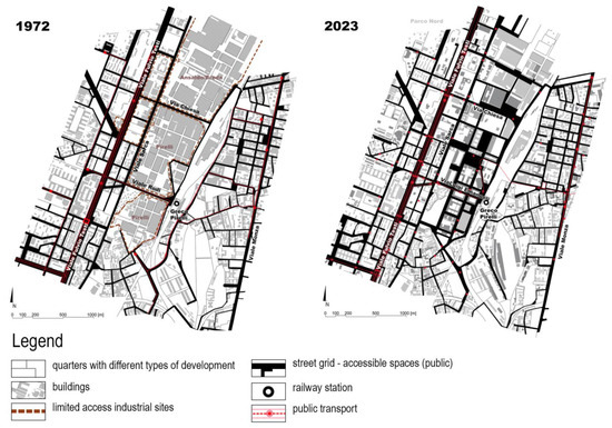 A comparative analysis of the street grid in 1972 and the current one indicates the development of public spaces in the post-industrial area. Still, the railroad line is a barrier dividing the area into an eastern part (developing along Viale Monza) and a western part (developing along Viale Fulvio Testi) (Figure 4). Historical and planning analysis indicates that the areas on both sides were shaped by a plan by Angelo Pavia and Giovanni Masera in 1912, which was a continuation of Beruto’s 1889 plan—expanding the city to include another strip between the new outer ring road of the city and the railroad and then directly from the Milan regulatory plan—the so-called Albertini plan of 1934. An analysis of the 1930 map (Carta Tecnica Comunale 1930, Comune di Milano) shows that the new street layouts changed the directions of agricultural parcels. In the 1972 layout, the industrial areas were large zones without public access. Only Viale Rodi and Via Chiesa were cross streets leading to the train station—Piazza Egeo and Via Sesto S. Giovanni. Today, in the post-industrial area, a structure of public spaces has been created with forms of streets, squares, and squares—with different qualities and functions.