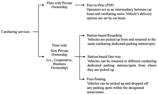 Carsharing is an example of Product-as-a-Service (PaaS), serving only the technical function of a car [21,22,23] and as part of a solution to sustainable mobility [1]. Several studies have documented the beneficial effects of carsharing, including: (1) complementing public transits in urban areas and to alleviate the car-related economic stress in car-dependent areas [24,25,26,27], (2) as a substitutive choice to private cars to effectuate car-ownership and vehicle kilometers [10,13,25,26], and (3) diverting the fit-for-purpose mobility demand away from a typical self-serving car rental choice with more flexible service designs and pricing strategies [17,28,29]. Based on the fleet ownership, carsharing services can be demarcated into private and non-private ownerships, as illustrated in Figure 1. Retaining the legal ownership enables the operator to govern the level of service: the extent to which the access regimes maximize users’ benefits. A carsharing service with non-private fleet falls into the access-based service [15].
