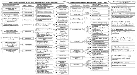 Figure 2 illustrates the three phases of modeling the conceptual framework. Phase 1 identified the actor-to-system interactions (Index A1 to A9) and actor-to-actor interactions (Index B1 to B16) in terms of value creations from interactions. Phase 2 reduced the overlapping values and translated remains into the captured values (Index 1 to 25) from the perspective of a carsharing system. Phase 3 grouped captured values into assessment metrics. The assessment metrics, i.e., market condition, business advantage, parking condition, EV deployment, self-serving configuration, vehicle reservation, vehicle maintenance, and pricing scheme were eventually derived.