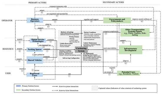 We first identified actors and their interactions based on existing empirical research on the carsharing business [20,30,38,40,41,42,43,44]. Actors were categorized into two types: (1) primary actors, which directly create values in affecting the supply and demand, and (2) secondary actors, which can affect the business innovations and, depending on the level of engagement, can create additional values. Primary actors include registered users, operators, shared vehicles, digital platforms and technologies, and parking spaces. Secondary actors include government and policymakers, potential users (e.g., residents and visitors), other transportation systems or agencies (e.g., public transits, ride hailing), and local infrastructure development.