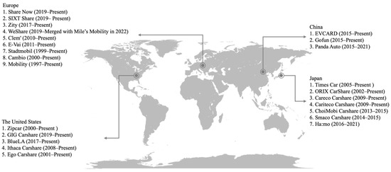 Carsharing cases from marketplaces in China, Europe, Japan, and the United States.
