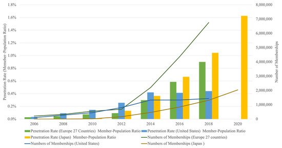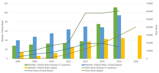 The carsharing market penetration showed rapid growth in the last two decades in Europe and the United States [47], which was earlier than that in Japan and China. The market trends and stories of the former are important to provide lessons for the latter. From 2012 to 2014, the market trend in Europe burgeoned on both the number of memberships and total fleet stock, as shown in Figure 5 and Figure 6. This is possibly attributed to the increase in carsharing awareness after a long period of market cultivation in viable service areas. The 2014 European Union (UN) survey on transportation and mobility found that the awareness of carsharing was increasing among those EU countries that have adopted carsharing schemes. In addition, the inclinations of carsharing members were more likely being observed among residents in those countries that had less motorization than the average motorization in the European region [48]. The increase in the fleet stock in the European market stopped in 2014, as shown in Figure 6, while the number of carsharing members was continuously growing. The European market is full of small-scale carsharing players, compared to those in the United States’ market. This enables them to agilely react to the dynamic market environment. A decline in the fleet stock in the United States market was also observed after 2014. While the fleet stock was decreasing, the number of memberships remained the same in the United States’ market. This is in part due to the business shrinks of nationwide companies, such as Car2go and Hertz 24/7. With the advent of ride-sourcing services, nationwide companies had to slim their assets in response to the growing market competitions [49].