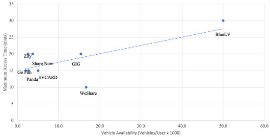 All stationary roundtrip cases reviewed in this research adopt the reserved-based regime. The rest of the cases, which operate in either the stationary one-way or free-floating schemes, all adopt the instant access regime. The maximum access time of instant access cases varies from 10 to 30 min. Figure 7 shows the relationship between the maximum access time and the vehicle availability for cases using the instant access regime, which can also infer various service levels. The higher vehicle availability the system has, the shorter time users will have to access a vehicle. The longer the maximum access time the system is set, the less anxiety users will feel to access the reserved vehicles. Therefore, the vehicle availability and the system maximum access time can both present the service level from opposite directions. In fact, exceptionally high service levels will have to compromise on the operational cost. Therefore, the safety time, which is residual between the maximum access time of the system and the actual vehicle access time, must be considered when evaluating the service level in the free-floating scheme.