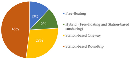 Figure 8 shows that 88% of cases in the dataset adopt a single access model; most of them are station-based schemes. The other 12% adopt a hybrid access model, which offers the free-floating and station-based carsharing dependent on service areas. For example, SIXT Share provides free-floating carsharing in Berlin and station-based one-way carsharing in Dresden.