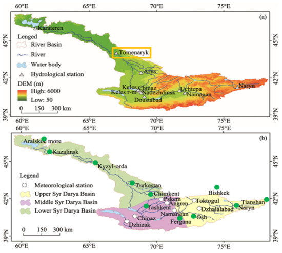 Overview of the Syr Darya River Basin as well as the location of the hydrological stations (a) and the meteorological stations in green (b). Figure adapted from Figure 1 in [24].
