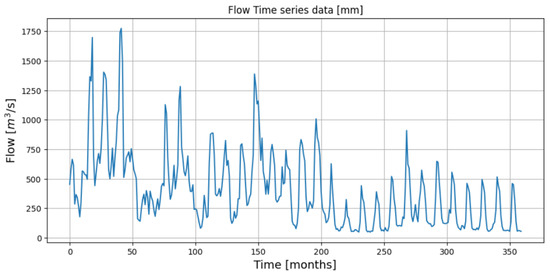 The flow data were collected at the Tomenaryk hydrological station, located in Kazakhstan (Figure 1a), and were recorded daily from January 1936 to December 1986. Data collected before 1957 were discarded from the dataset due to some recurring portions of missing values. The resulting dataset comprised 30 years of streamflow data spanning from January 1957 to December 1986. The entire length of the sequence of the flow dataset did not present any missing values; thus, no deletion or imputation processes were required. The mean flow data were then converted into monthly data for the challenge of forecasting. The graph of the flow data of the Syr Darya River is shown in Figure 2.