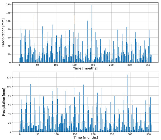 The rainfall data were sourced from the Global Historical Climate Network (GHCN) database. The rainfall data were collected at 11 stations located throughout the catchment area on the upstream and downstream sides of the Tomenaryk station. The locations of the meteorological stations are highlighted by the green dots in Figure 1b. Missing values were recorded as zeros (i.e., no precipitation). The graph of the rainfall data for the Naryn and Tien-Shan stations is shown in Figure 3 (other rainfall graphs are not shown for brevity).