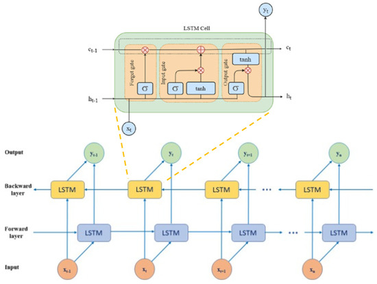 Architecture of a single LSTM cell (top) and a bidirectional LSTM network (bottom).