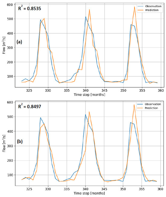 Comparison between forecasted and observed streamflow in the Syr Darya River during the validation period in the FO scenario, (a) LSTM, and (b) BILSTM.
