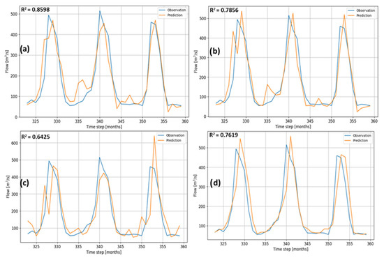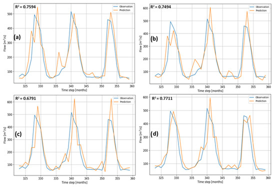 Comparison between forecasted and observed streamflow in the BILSTM case during the validation period in (a) the All-RF scenario, (b) the Up-RF scenario, (c) the Down-RF scenario, and (d) the P-RF scenario.