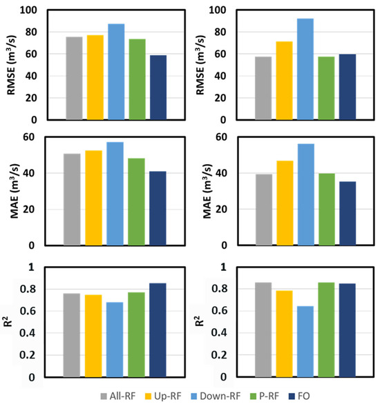 Figure 8 shows the performance metrics recorded in all the scenarios in the LSTM and BILSTM cases during the validation phase. In the LSTM case, the FO scenario exhibited the best forecasting performance among all the scenarios, while the Down-RF scenario yielded the least accurate predictions. Specifically, the RMSE values were 75.59 m3/s, 77.14 m3/s, 87.29 m3/s, 73.73 m3/s, and 58.97 m3/s in the All-RF, Up-RF, Down-RF, P-RF, and FO scenarios, respectively. In other words, the RMSE was increased by about 28%, 31%, 48%, and 25% compared to the FO scenario in the All-RF, Up-RF, Down-RF, and P-RF scenarios, respectively. The MAE values were 50.72 m3/s, 52.46 m3/s, 57.09 m3/s, 48.21 m3/s, and 40.88 m3/s in the All-RF, Up-RF, Down-RF, P-RF, and FO scenarios, respectively. This means that the MAE was increased by 24%, 28%, 40%, and 18% in the All-RF, Up-RF, Down-RF, P-RF, and FO scenarios, respectively. Regarding the overall fit, the highest and lowest R2 values were in the FO and Down-RF scenarios, respectively, with 0.8535 and 0.6791 recorded in the former and the latter. The scenarios All-RF, Up-RF, and P-RF yielded comparable fits.