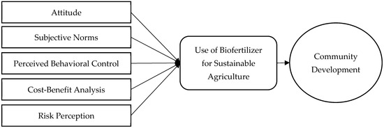 The basic underpinning support in this study is taken from the Theory of Planned Behaviour (TPB) [18] and Expected Utility Theory (EUT) [19]. TPB considers that human beings perform their behaviors based on attitudes, subjective norms, perceived behavioral control, cost and benefit analysis, and risk perception. In this study, the variables identified by the theory are taken as a basis behind the behaviors of farmers in utilizing biofertilizers in their agricultural activities. In addition to that, EUT talks about the mathematical models for decision-making making are taken to strengthen the propositions made. The two theories form the theoretical basis for developing the model and extending it to community development. Community development in this study is measured considering the increased productivity, increased economic activity, increased utilization of land, and increase in employment.