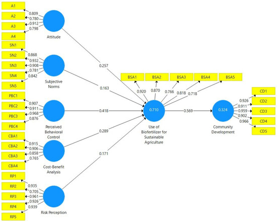 However, if the variable values are 0.7 or higher, they are considered highly significant. In addition, AVE reveals that the values of AVE measured are above the threshold level of 0.50 [30]. Hence, the analysis of construct reliability and validity for attitude, cost–benefit analysis, perceived behavioral control, risk perception, subjective norms, use of biofertilizer for sustainable agriculture, and community development are shown in Table 2.