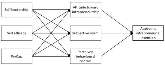 The theory of planned behavior (TPB) explains that intention is the indicator of how much effort people are willing to spend to realize a planned behavior [17]. Ajzen [18] focuses on the relationships between attitudes towards behavior, social norms, perceived behavioral control, and intention. This study uses the TPB to explain the antecedents of academic intrapreneurial intention and tries to make a contribution to the literature by including self-leadership, psychological capital, and self-efficacy as potential antecedents in a structural equation model. In this context, this study considers that determining the effects of variables used with the TPB on the intrapreneurial intentions of academicians will make a significant contribution to the literature and the higher education sector in general.