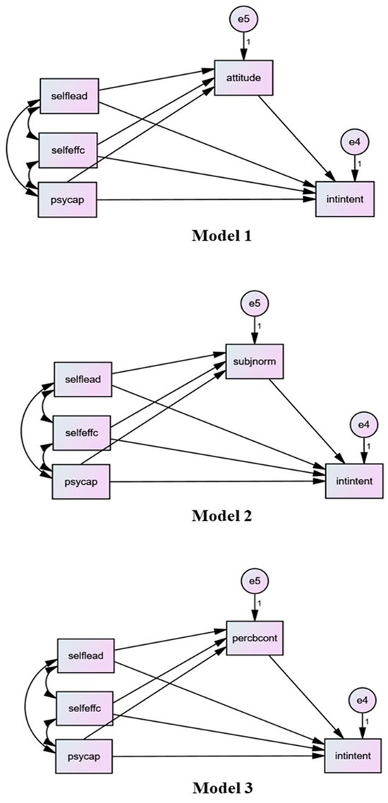 To test the research hypotheses, we established three different structural equation models using IBM AMOS 21.0 software. In the models, we treated academic intrapreneurial intention as the dependent variable; self-leadership, self-efficacy, and PsyCap as independent variables; and attitudes toward intrapreneurship, subjective norms, and perceived behavioral control individually as mediating variables. The AMOS models can be seen in Figure 2.