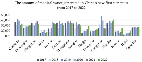 Figure 5, the medical waste generated volume in these cities showed an upward trend from 2017 to 2019, slowed down from 2019 to 2021, and then increased in 2022. This phenomenon is mainly attributed to the outbreak of COVID-19 in 2019 and the surge in medical activities caused by the shift in China’s epidemic prevention policies from “preventing infection” to “protecting health and preventing severe cases” in 2022.