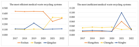 Table 9 illustrates the efficiency of MWCSs and MWTSs in CNFCs from 2017 to 2022. Suzhou, Tianjin, Dongguan, Foshan, and Qingdao have higher efficiency in MWCSs and the MWTSs, indicating that these five cities have certain reference values for other cities in medical waste recycling. However, Hangzhou has the lowest MWCS and MWTS efficiencies for the past five years, at 0.493 and 0.440, respectively.