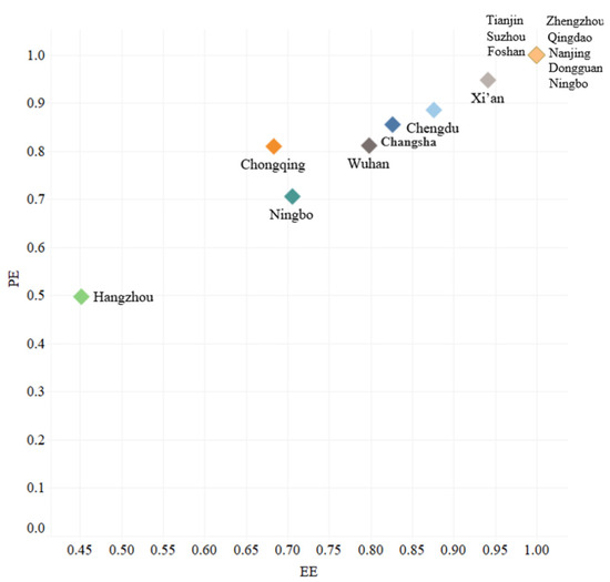 Figure 8. Zhengzhou, Qingdao, Dongguan, Nanjing, Suzhou, Foshan, and Tianjin all have PE and EE scores of 1, indicating a high technological level and environmental emission capacity. It is worth noting that Hangzhou still maintains low PE and EE scores, with the lowest scores at 0.334 and 0.281, respectively. PE and EE in these cities are closely correlated. This phenomenon can be attributed to two factors. First, cities with higher levels of waste disposal technology have stricter environmental requirements for waste management, leading to a strong correlation between production and environmental emission capacity. Second, environmentally friendly companies have a higher appeal to customers, contributing to the close relationship between production and environmental emission capacity.