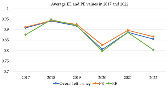 Figure 9, the new first-tier cities’ medical waste recycling systems had inefficient scores (the highest is only 0.942) over the entire sample period. Unified efficiency, PE, and EE show an increasing trend from 2017 to 2018, followed by a slight decline in 2019. They reach their lowest point in 2020 and gradually recover in 2021. When medical activities surged again in 2022, overall efficiency, PE, and EE decreased once more, revealing a significant deficiency and severe lack of resilience in the medical waste recycling systems of these cities. In particular, EE was the most severely affected, suggesting the need for additional attention to environmental protection in medical waste recycling systems.