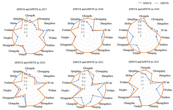 Figure 10, the efficiencies of MWCSs show a gradual increase from 2017 to 2018, with 10 cities achieving a score of 1 in 2018. The efficiencies of MWTSs continue to increase from 2017 to 2019, with 12 cities achieving a score of 1 in 2019. Both the MWCSs and the MWTSs experienced their lowest efficiencies in 2020, with a gradual recovery observed in 2021. It is important to highlight that even though the overall efficiency and the efficiencies of MWTSs experienced a decline in 2022, there has been an observed improvement in MWCSs. This indicates that the resilience of the MWCSs has been significantly improved since the year 2020.