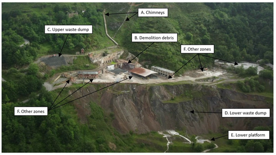 Very thorough prior knowledge about the site exists, allowing us to define six different areas (Figure 1). In general, the first step to improving knowledge is to study the site to understand how and where different mining and metallurgic activities have been carried out in the past. A second step is to take some soil samples to obtain the concentration of PTEs in the soil; in this case, the results from previous studies carried out in the area can be used. From these two steps, different zones with different concentrations of As and Hg (clearly related to the different mining and metallurgical processes in these places) can be defined.