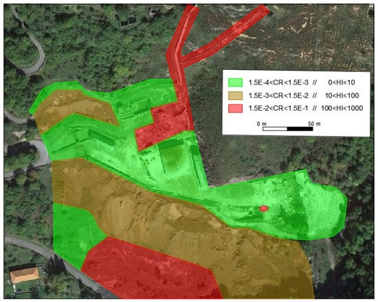 There is a less critical zone (in green in Figure 3), although it remains a high-risk area in general, as the indices exceed the HI > 1 and CR > 10−5 limit values. This means that, in this zone, regular work or industrial activity could not be carried out over a 40-year working life. However, conditions could be found where the CR and HI values decrease below 10−5 and 1, respectively.