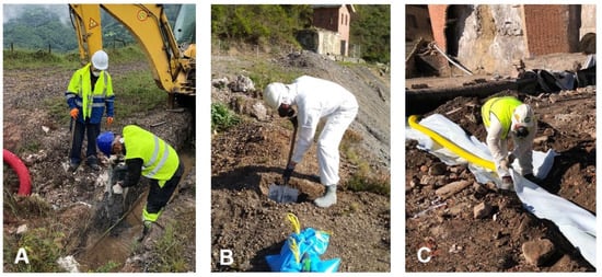 There are other areas (brown colour in Figure 3) where the soil is contaminated with arsenic and mercury but the concentration of mercury in the air is not too high; specifically, less than 10−3 mg/m3. Normal activity cannot be conducted in these areas; they involve special tasks where workers must wear more protection, such as full-body suits to protect the skin from contact with materials, or special gloves. However, work can be carried out in these areas for the entire day (8 h/day) and throughout the year (240 days/year). An example of this is presented in Figure 4B, where a worker is shown collecting samples in the upper waste dump, where the average concentrations of As and Hg in the soil are 16,107 and 3646 mg/kg, respectively, and the average concentration of Hg in the air throughout the year is 5.1 × 10−4 mg/m3.