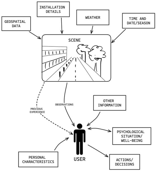The central section of the figure features a scene with lighting operating in a particular mode, under specific weather conditions and at a given time and date. This scene can be considered as everything the user can observe and/or has observed in the past and uses as previous experience. The scene may, therefore, be seen as the sum of the road characteristics (e.g., width, lane structure, pavements) and the context of the road, such as the existence of buildings, greens and the character of the area (residential, industrial, commercial, etc.). The physical elements can be easily assessed by human designers on single streets and in very small areas, but some difficulties arise when moving to a larger scale. The data usually exist in GIS (Geographic Information System) datasets. Although currently existing spatial data analysis tools can be used to integrate separate GIS datasets, the process can be time-consuming and error-prone. However, graph-based methods, such as STGT (Spatially Triggered Graph Transformations), can be used to visualize the detected spatial relationships between objects, and have been successfully used to improve the energy efficiency of lighting [].