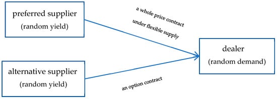 Second, referencing some studies in the literature [6,11,34], the demand and the yield of agricultural products are random. Under the wholesale price contract, with decentralized decision making, the supplier’s supply quantity is flexible, which means the quantity can vary between the dealer’s order quantity and the actual outputs. Then, the dealer and supplier, respectively, determine order or production quantity. Under centralized decision making, the members make decisions as a whole. Under mixed contracts, the dealer signs a wholesale price contract with the preferred supplier and the supply quantity is flexible. At the same time, the dealer signs an option contract with the alternative supplier to reduce the risk of supply and demand mismatch. If the preferred supplier under-supplies, the alternative supplier can supply finished goods in time with good quality, and the quantity is not more than the option order quantity.