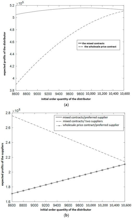 Figure 2. The relationships between the expected profits of members and initial order quantity of the distributor under different contracts. (a) The dealer’s expected profits. (b) The suppliers’ expected profits.