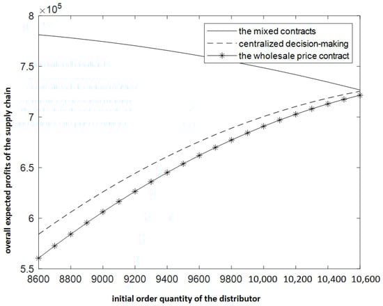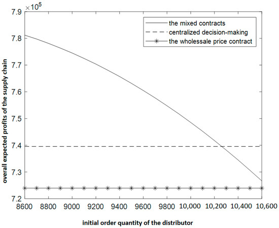 Under mixed contracts, taking o = 40 and e = 160 as an example, Figure 5 shows analysis of the impacts of the initial order quantity of the dealer on the sum of profits for the supply chain members. It is shown that, no matter what value the initial order quantity takes, the sum of profits for the members is higher than that under the wholesale price contract; within the range [8600, 10,200], it is higher than that under centralized decision making.